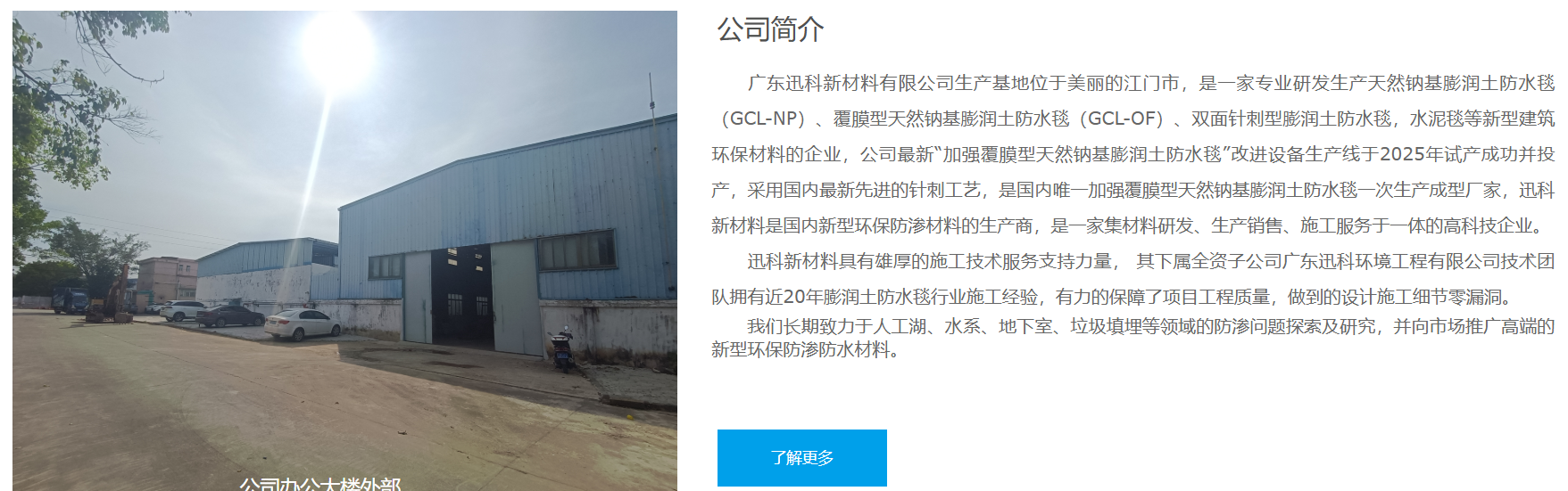 广东迅科新材料有限公司生产基地位于美丽的江门市,是一家专业研发生产天然钠基膨润土防水毯(GCL-NP)、覆膜型天然钠基膨润土防水毯(GCL-OF)、双面针刺型膨润土防水毯,水泥毯等新型建筑环保材料的企业,公司最新“加强覆膜型天然钠基膨润土防水毯”改进设备生产线于2025年试产成功并投产,采用国内最新先进的针刺工艺,是国内唯一加强覆膜型天然钠基膨润土防水毯一次生产成型厂家,迅科新材料是国内新型环保防渗材料的生产商,是一家集材料研发、生产销售、施工服务于一体的高科技企业。