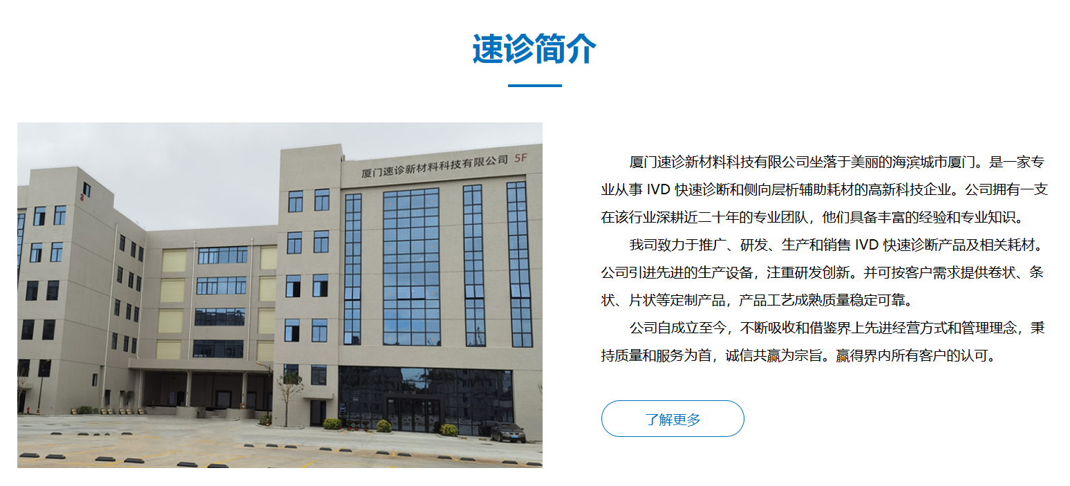 厦门速诊新材料科技有限公司坐落于美丽的海滨城市厦门。是一家专业从事 IVD 快速诊断和侧向层析辅助耗材的高新科技企业。公司拥有一支在该行业深耕近二十年的专业团队,他们具备丰富的经验和专业知识。