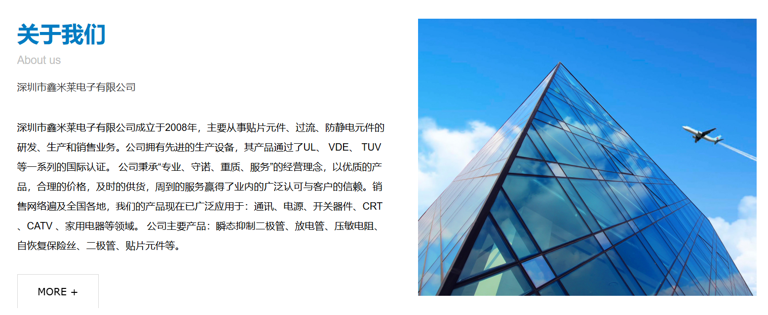 深圳市鑫米莱电子有限公司成立于2008年,主要从事贴片元件、过流、防静电元件的研发、生产和销售业务。公司拥有先进的生产设备,其产品通过了UL、 VDE、 TUV等一系列的国际认证。