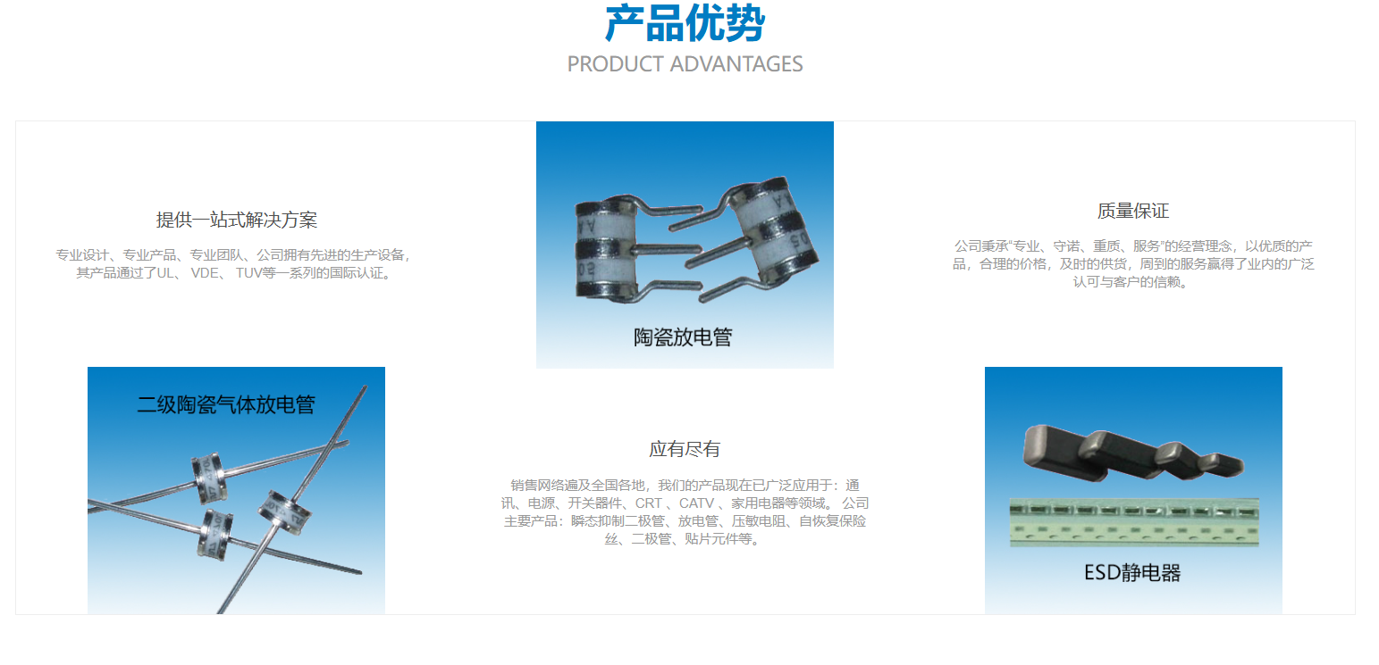 公司主要产品:瞬态抑制二极管、放电管、压敏电阻、自恢复保险丝、二极管、贴片元件等。
