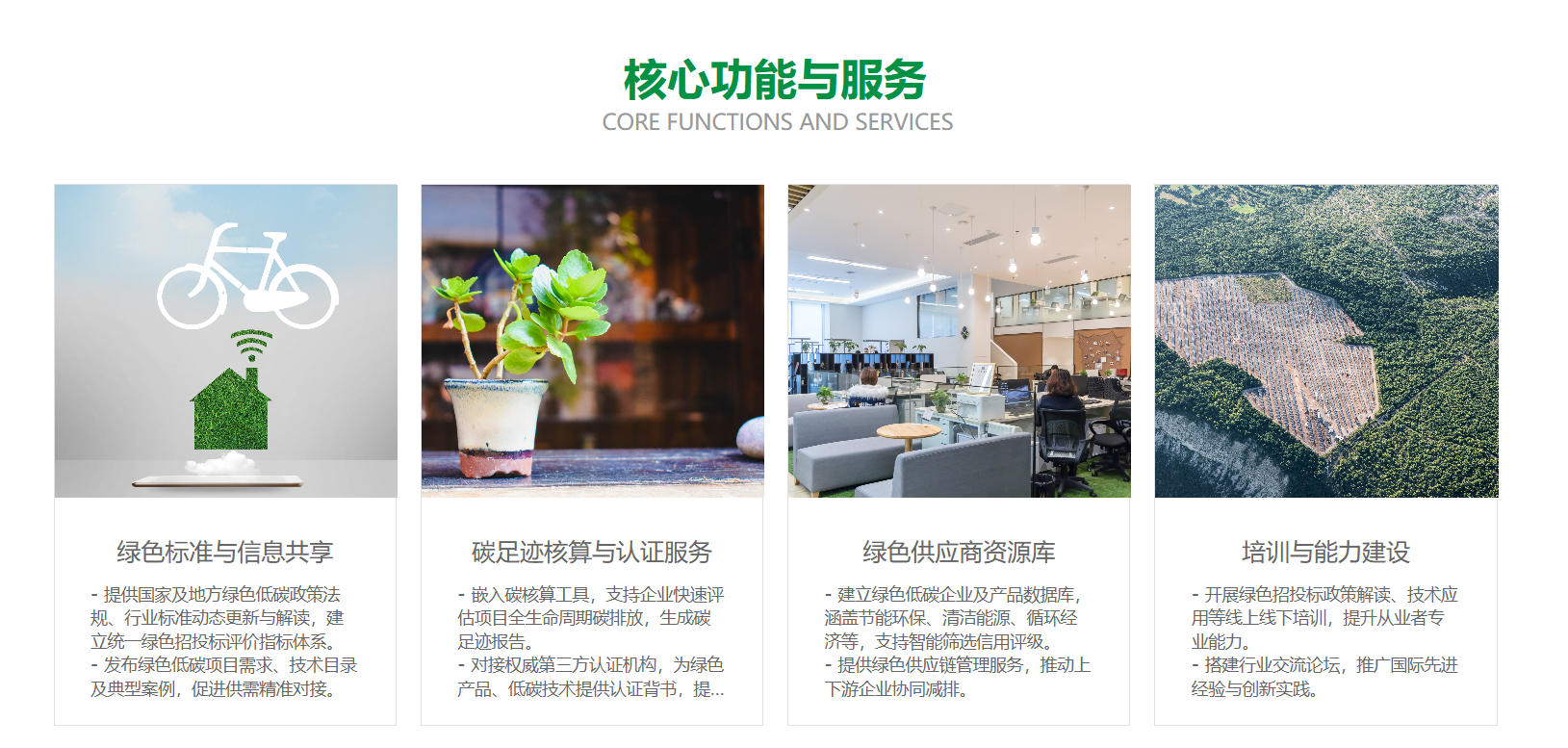 招投标领域绿色低碳公共服务平台是响应国家“双碳”战略目标、推动经济社会绿色转型的重要创新载体。平台聚焦招投标全产业链,以数字化、智能化技术为支撑,整合绿色低碳政策、技术、产品、服务及金融资源,致力于为政府、企业、机构提供一站式绿色低碳解决方案,助力构建低碳高效的招投标生态体系,赋能行业可持续发展。