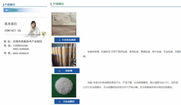 白银龙盛化工有限公司选用我司企业化工原料行业的网站优化产品,其SEO关键词有 甘肃白银龙盛化工有限公司,兰州聚合硫酸铁生产,兰州净水剂生产,兰州聚合氯化铝生产,白银龙盛,白银龙盛化工。其特点是用很合适的展示方式、展示效果、站点框架,把客户及其用户很关心的问题突出表现;并以简洁明朗的设计风格,清晰展现公司水平实力,确保一秒抓住目标用户眼球,给用户留下良好的第一印象。白银龙盛化工有限公司成立于2009年,是经白银市市场监督管理局审核的有资质的公司,其统一社会信用代码:91620400690355828A。公司地址:甘肃省白银市白银区中科院白银高技术产业园。