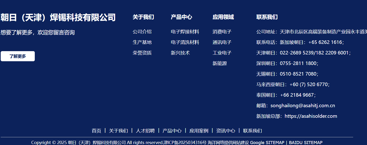 朝日是谁:朝日(天津)焊锡科技有限公司(以下称为“天津朝日”)成立于2017年,是新加坡朝日化学及锡焊制品工业私人有限公司的子公司,属于外商独资企业。总部新加坡朝日化学及锡焊制品工业私人有限公司成立于1977年,距今已有40多年的历史。朝日在全球范围内分布的子公司现已有近十家。