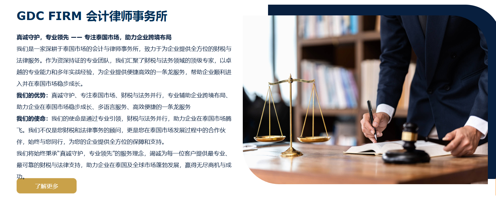我们是一家深耕于泰国市场的会计与律师事务所,致力于为企业提供全方位的财税与法律服务。作为资深持证的专业团队,我们汇聚了财税与法务领域的顶级专家,以卓越的专业能力和多年实战经验,为企业提供便捷高效的一条龙服务,帮助企业顺利进入并在泰国市场稳步成长。
