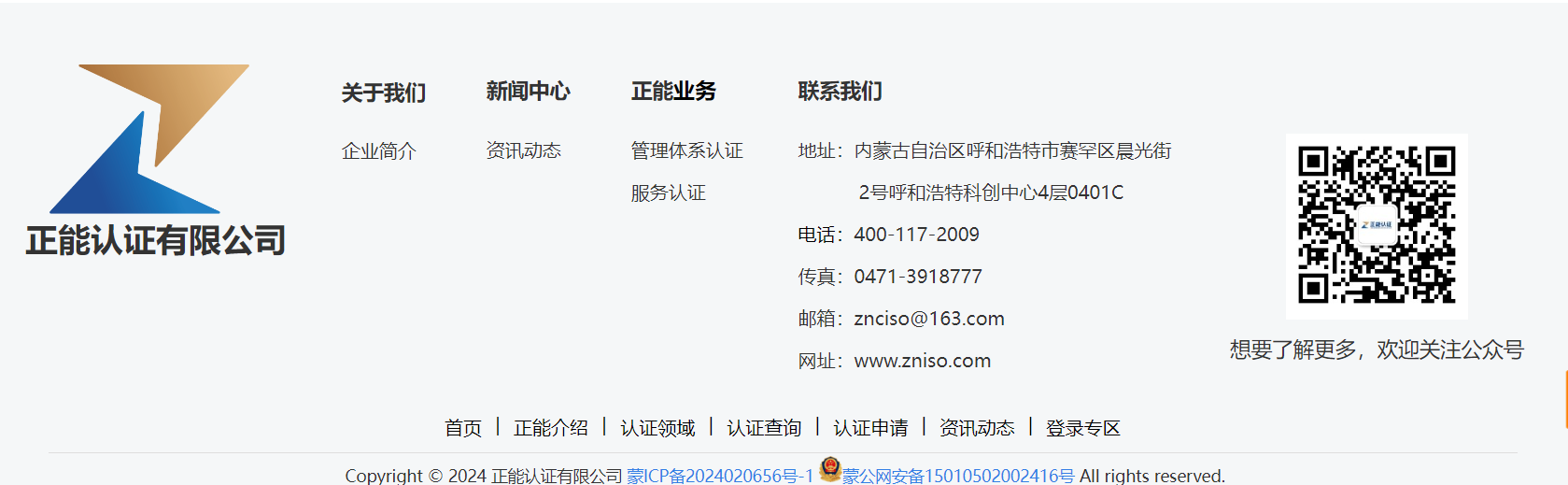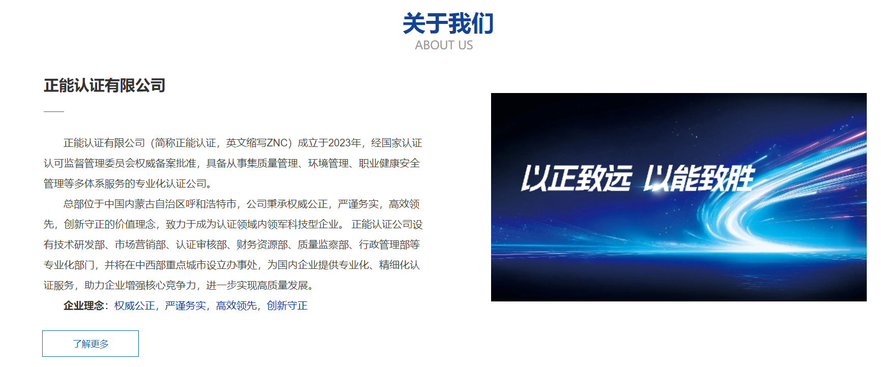 正能认证有限公司(简称正能认证,英文缩写ZNC)成立于2023年,经国家认证认可监督管理委员会权威备案批准,具备从事集质量管理、环境管理、职业健康安全管理等多体系服务的专业化认证公司。
